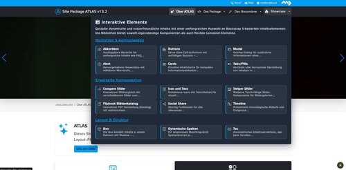Das Mega-Menü ist in ATLAS als Option umgesetzt: Ein Menüpunkt kann im Dropdown nicht nur Links zeigen, sondern auch Content, der aus tt_content gerendert wird. Das eignet sich vor allem für Seiten, bei denen die Navigation schnell „zu viel“ wird, wenn man nur Linklisten ausspielt. Mit Content im Dropdown kann man strukturieren: kurze Teaser, Icons, Hinweise, CTAs oder kleine Übersichten.