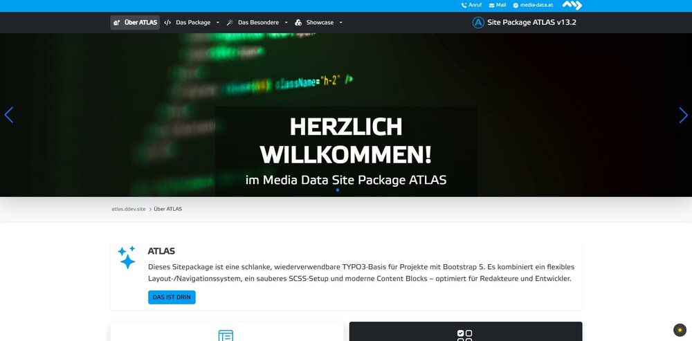Eine besondere Layout-Variante ist das Sidebar-Menü: Statt einer horizontalen Top-Navigation kann ATLAS auch ein vertikales, seitliches Hauptmenü ausgeben. Das ist vor allem für Dokumentations- und Feature-Seiten praktisch, weil lange Menüstrukturen übersichtlich bleiben, mehr Platz für Kapitel entsteht und die Navigation wie eine echte „App-Sidebar“ wirkt.