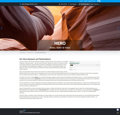 Atlas unterstützt dabei mehrere typische Hero-Szenarien: ein einzelnes Bild als ruhiger Einstieg, mehrere Medien als Slider oder ein Video, wenn ein bewegtes Intro sinnvoll ist. Das Frontend entscheidet anhand der hinterlegten Medien automatisch, welche Variante ausgegeben wird. So bleibt das Verhalten konsistent – unabhängig davon, ob eine Seite eher minimalistisch startet oder einen stärkeren visuellen Auftakt braucht.