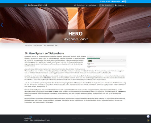 Gerade bei Slidern und Videos ist diese Kombination aus festen Regeln und sinnvollen Stellschrauben wichtig: Atlas lässt genug Spielraum für unterschiedliche Seitenauftritte, hält die Ausgabe aber in einem Rahmen, der Layout, Typografie, Overlays und Wirkung zusammenhält. So entsteht ein Hero, das sich projektweit einheitlich anfühlt – und trotzdem pro Seite passend skaliert werden kann.