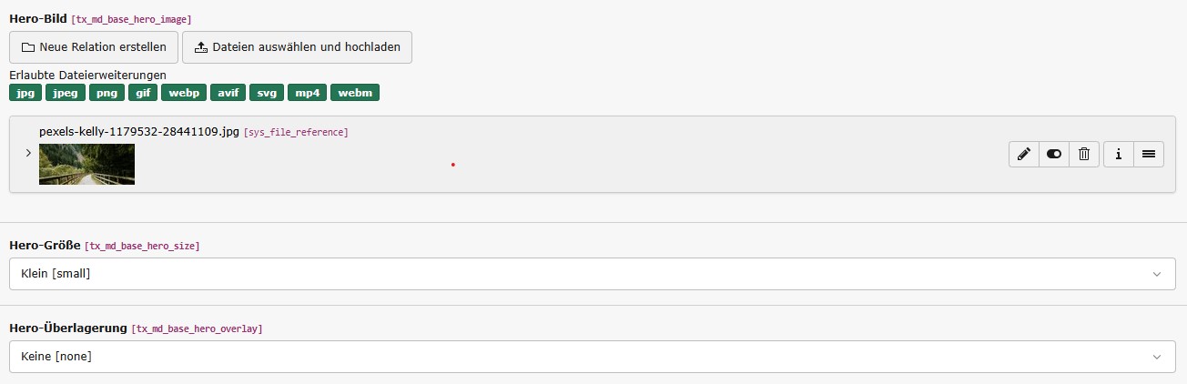 Was den Inhalt betrifft, nutzt Atlas vorhandene Daten konsequent: Zu jedem Hero-Bild oder -Video kann Text ausgegeben werden, indem Titel und Beschreibung aus den Medien-Metadaten herangezogen werden. Beim Einzelbild gibt es zusätzlich einen klaren Fallback: Wenn am Medium kein Titel gepflegt ist, wird automatisch der Seitentitel als Überschrift verwendet. Dadurch erhält man schnell einen sauberen Einstieg, ohne dass zwingend Metadaten gepflegt werden müssen – und kann ihn bei Bedarf gezielt anreichern.